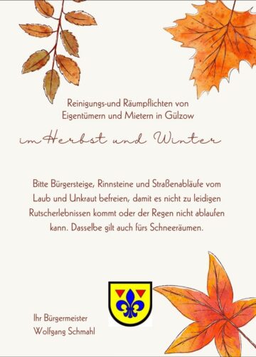 Amtliche Meldung Gülzow Der Bürgermeister Wolfgang Schmahl und die Gemeinde Gülzow Informiert: Marcus Klüber Posted on 13. Nov 2025 Der Beitrag steht unter Einhaltung der Bildrechte von Dritten zur freien Verfügung.