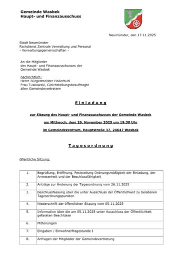 Amtliche Meldung Wasbek Der Haupt- und Finanzausschuss lädt ein zu seiner nächsten Sitzung. Schaut vorbei, bringt euch ein, stellt eure Fragen, informiert euch aktiv. Die Agenda öffnet ihr per Klick auf den Bildschirm. Matthias Gerken Posted on 18. Nov 2025 Screenshot Screenshot Der Beitrag steht unter Einhaltung der Bildrechte von Dritten zur freien Verfügung.