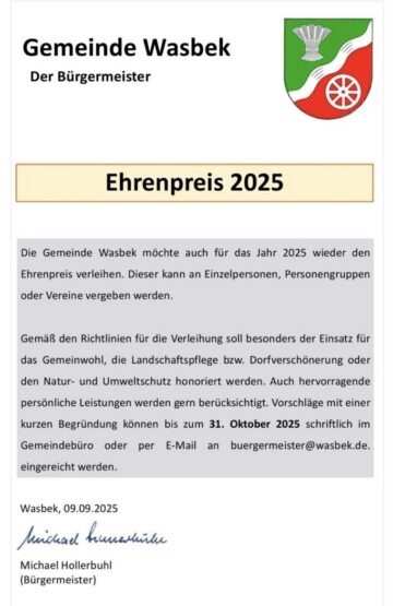 Amtliche Meldung Wasbek Ehrenpreis 2025 – reicht jetzt noch eure Vorschläge bis 31.10.2025 ein. Matthias Gerken Posted on 16. Okt 2025 Screenshot Der Beitrag steht unter Einhaltung der Bildrechte von Dritten zur freien Verfügung.