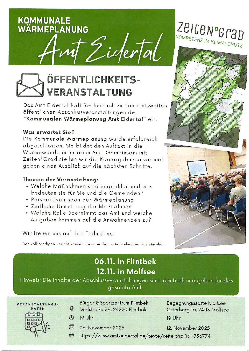 Am 06.11.2025 in Flintbek sowie am 12.11.2025 in Molfsee findet die 2. Veranstaltung des Amtes zur Kommunalen Wärmeplanung statt.