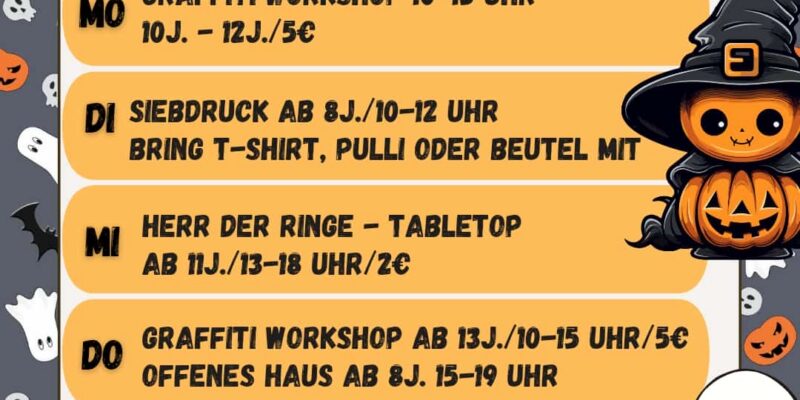 Das Jugendzentrum Büchen präsentiert ein kunterbuntes und cooles Ferienprogramm für die kommenden Herbstferien. Anmeldung und Treffpunkt im Jugendzentrum Büchen, Moorweg 18, neben dem Waldschwimmbad.