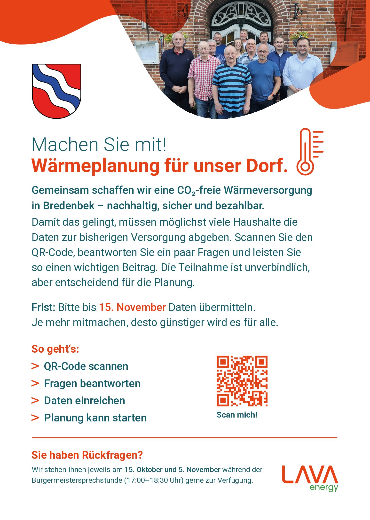 die Gemeinde plant in Zusammenarbeit mit der Firma LAVA ENERGY eine CO₂-freie Wärmeversorgung in Bredenbek – nachhaltig, sicher und bezahlbar.