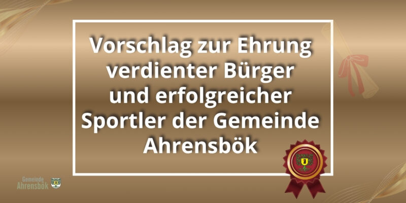 Die schriftlichen Vorschläge für die Ehrungen und Auszeichnungen können bis zum 12.11.2025 mit einer Begründung beim Bürgermeister der Gemeinde Ahrensbök, Poststr. 1, 23623 Ahrensbök oder per E-Mail an: info@ahrensboek.de eingereicht werden.
