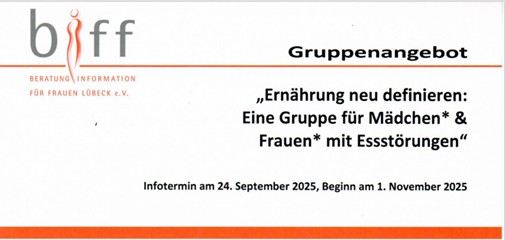 Ab Samstag, den 1.November 2025, bietet biff (Beratung und Information für Frauen* Lübeck e.V.) an 4 Samstagen jeweils von 10 bis 14 Uhr die Gruppe „Ernährung neu definieren: Eine Gruppe für Mädchen* & Frauen* mit Essstörungen“, geleitet von der Ernährungswissenschaftlerin Chantal Jaspert, an.