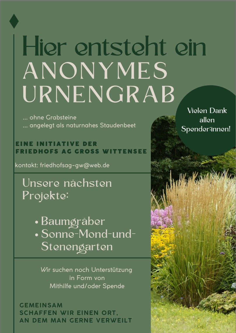 Bereits seit Anfang 2025 engagiert sich im Auftrag der Gemeinde eine Arbeitsgemeinschaft für die Neugestaltung und Aufwertung des Friedhofs Gross Wittensee. Ziel der AG ist eine naturnahe Entwicklung und Aufwertung des Erscheinungsbildes mit heimischen Pflanzenarten, die den Friedhof als würdevollen Ort der Erinnerung und zugleich als lebendigen, naturnahen Grünraum stärkt, der zum Verweilen einlädt.
