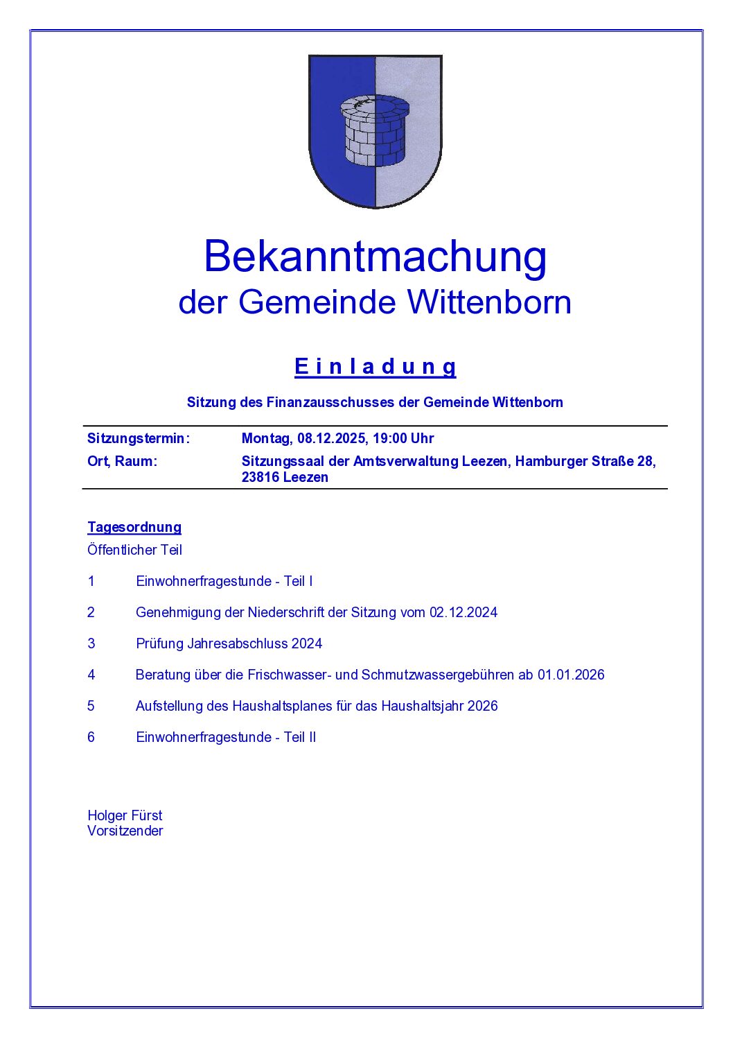 Der Finanzausschuss der Gemeinde Wittenborn hat seine nächste Sitzung am Montag, 08.12.2025 um 19:00 Uhr im Sitzungssaal der Amtsverwaltung Leezen, Hamburger Str. 28, 23618 Leezen.