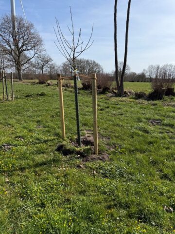 Die Gemeindearbeiter haben im Rahmen einer Ersatzpflanzung einen Hochzeitsapfelbaum gepflanzt, der in Schleswig-Holstein seinen Ursprung hat und, wenn er erwachsen ist, ab September geerntet werden kann.