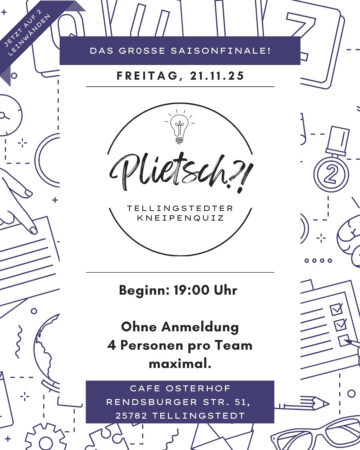 Am Freitag, den 21.11.2025 um 19.00 Uhr im Cafe Osterhof, Rendsburger Str. 51, Tellingstedt heißt es zum letzten Mal in diesem Jahr: Köpfchen anstrengen, Teamgeist zeigen und Spaß haben! Beim großen Finale unseres beliebten Kneipenquiz‘ wird noch einmal gerätselt, gelacht und gejubelt – bevor es in die Winterpause geht. Wer holt sich den Sieg der Saison?