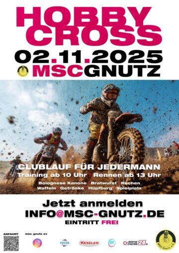 02. Nov Veranstaltung Gnutz HobbyCross beim MSC Gnutz! MSC Gnutz Posted on 11. Okt 2025 Am Sonntag, den 02.11. lädt der MSC Gnutz zum Clublauf für Jedermann ein: https://msc-gnutz.de/ Add to calendar zu Google Kalender hinzufügen iCalendar Outlook 365 Outlook Live Details Datum: 2. November Eintritt: Free Veranstaltungsort MSC-Platz 24622 Gnutz, + Google Karte Veranstalter MSC Gnutz