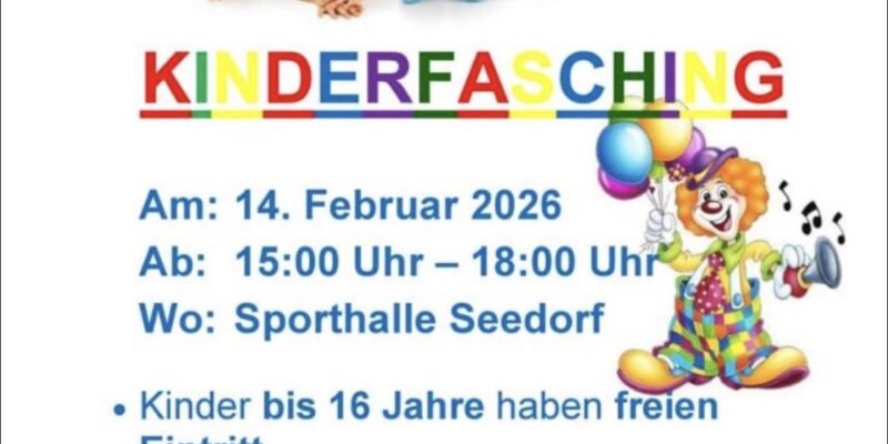 14. Feb Veranstaltung [Amtlicher Beitrag] Kinderfasching am 14.02.2026 15-18 Uhr TSV Seedorf – Sterley Posted on 08. Feb 2026 Add to calendar zu Google Kalender hinzufügen iCalendar Outlook 365 Outlook Live Details Datum: 14. Februar Zeit: 15:00 - 18:00 Veranstaltungskategorien: Kinder & Jugend, Veranstaltungen Veranstaltungsort Seedorf Seedorf, 23883 + Google Karte Veranstalter TSV Seedorf – Sterley Phone 04545789198