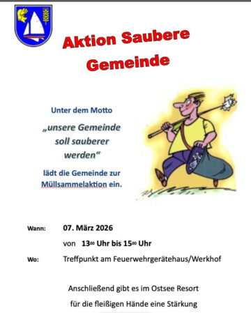 Die Gemeinde und der Tourismus Damp e.V. rufen zur Teilnahme am Frühjahrsputz auf. Die Aktion findet am Samstag, 7. März, von 13 bis 15 Uhr statt und wird zeitgleich mit der landesweiten Initiative „Unser sauberes Schleswig-Holstein“ durchgeführt.