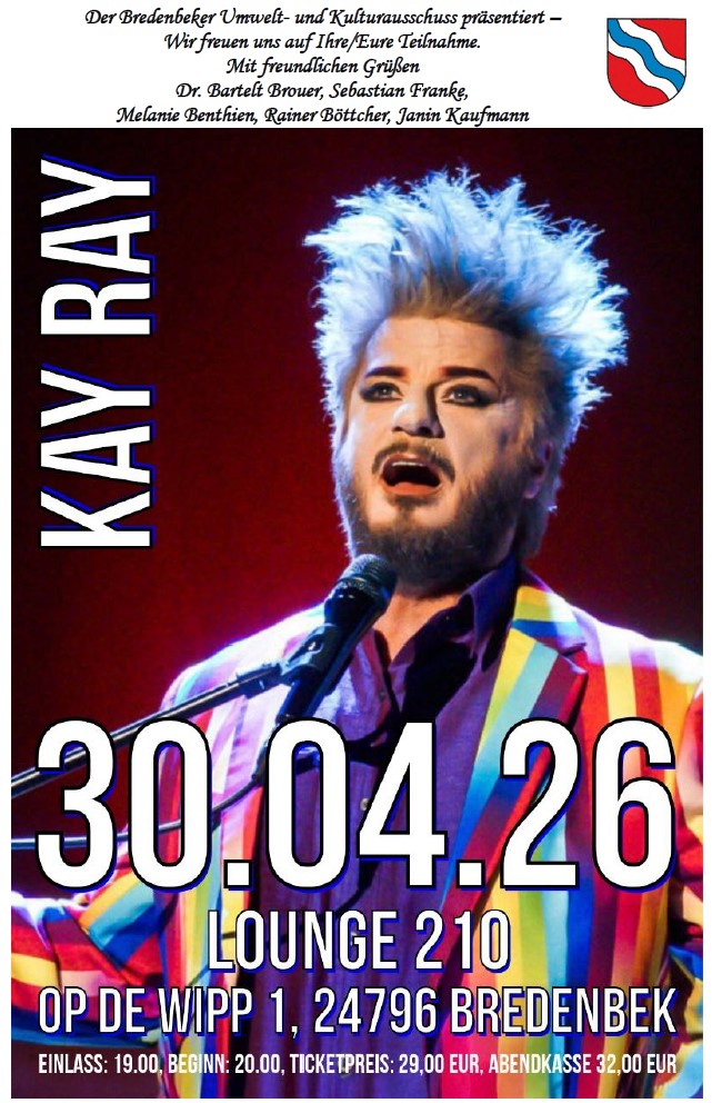Donnerstag, 30.04.2026 in der Lounge 210, Op de Wipp 1, Bredenbek: Comedy-Show mit Kabarettist und Entertainer "Kay Ray". Einlass: 19:00 Uhr Beginn: 20:00 Uhr Ticketpreis: 29,00 € Abendkasse 32,00 €…