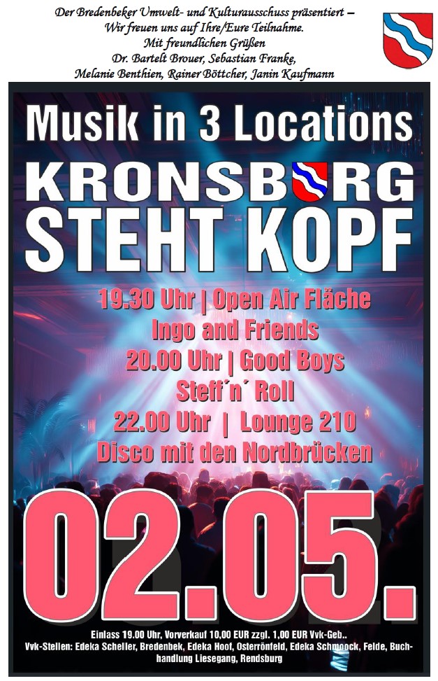 Samstag, 02.05.2026 in Bredenbek OT Kronsburg: "Kronsburg steht Kopf" - Live-Musik in drei Locations Programm: 19:30 Uhr Open Air Fläche: Ingo and Friends 20:00 Uhr Vereinsheim Good Boys: Steff'n'Roll 22:00…