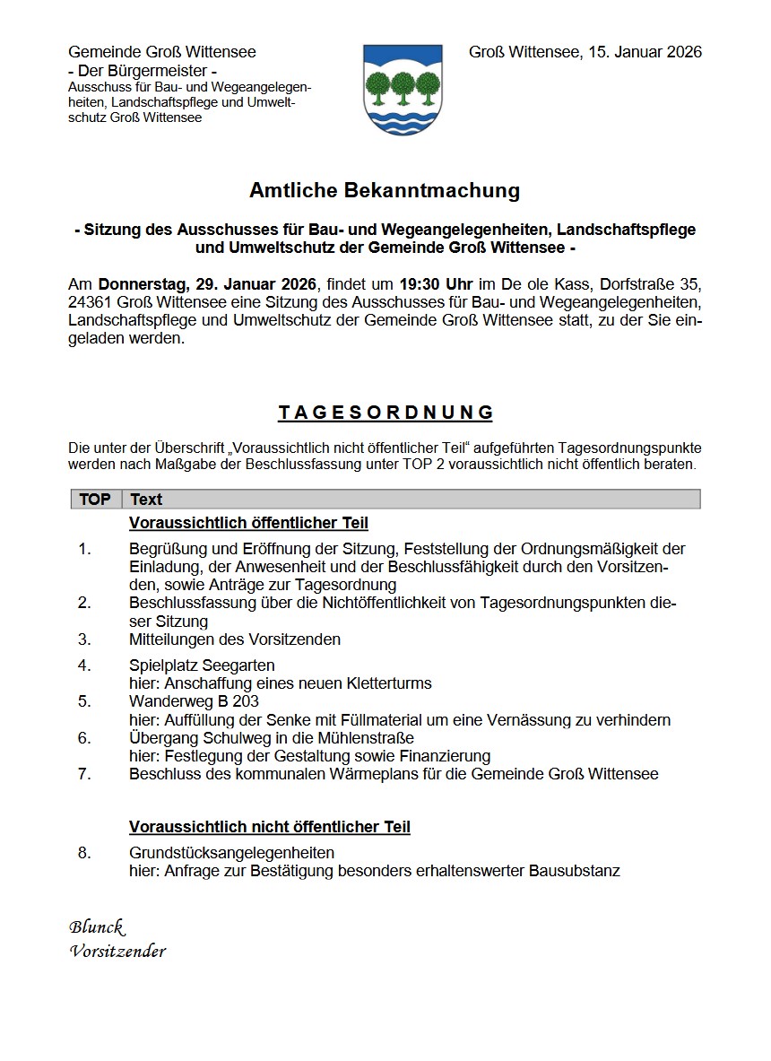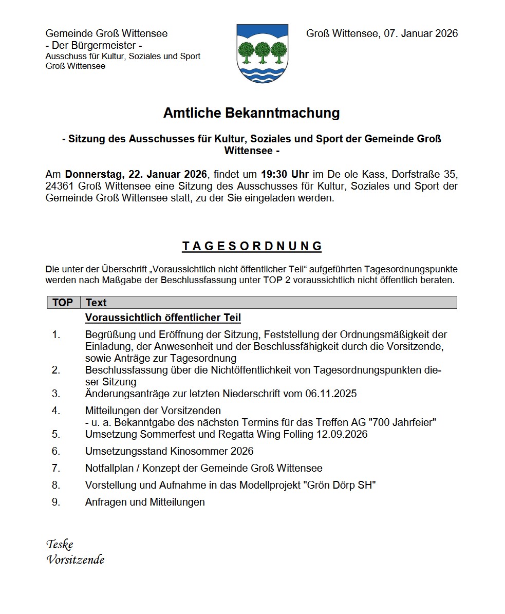 Wir laden Sie herzlich ein zur öffentlichen Veranstaltung am Donnerstag, 22.01.2026 um 18:30 Uhr in der Amtsverwaltung, Sitzungssaal, Mühlenstraße 8 in 24361 Groß Wittensee. Die Veranstaltung findet gleichzeitg vor Ort… |