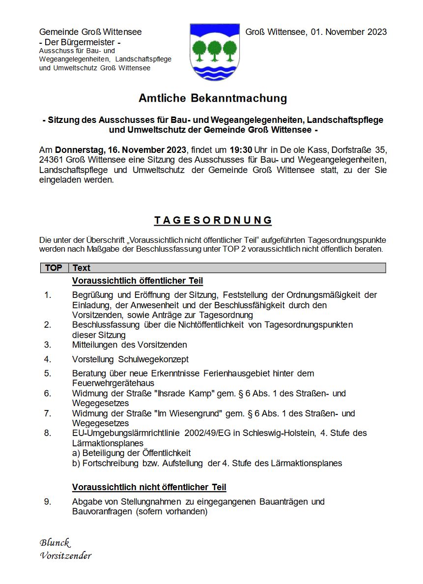 Die öffentliche Sitzung findet statt am: Mittwoch, den 01.11.2023 19:00 Uhr im Feuerwehrgerätehaus Folgende Themen stehen u.a. an: Verpflichtung bürgerlichen Ausschussmitgliedern Beratung über den Festakt zum 50-jährigen Jubiläum…