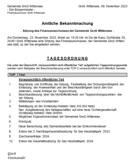 Tagesordnung: öffentlich 1. Einwohnerfragestunde 2. Niederschrift Nr. 2 der letzten Sitzung vom 25.09.2023 3. Mitteilungen 4. Schleswig-Holstein Netz AG: Ausgliederung des Netzgeschäftes auf eine neue Tochtergesellschaft (Schleswig-Holstein Netz GmbH) 5.… |