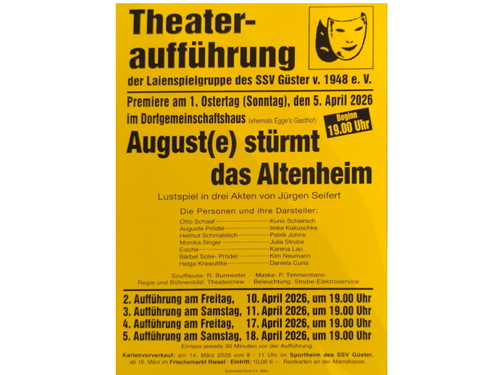 „August(e) stürmt das Altenheim“ – der Titel, den die Theatertruppe des SSV Güster an Ostern auf die Bühne bringt, klingt mal wieder verheißungsvoll: Da sind wohl turbulente, herzerwärmende und verdammt…