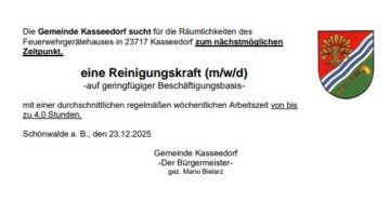 Wir suchen eine Reinigungskraft für unser Feuerwehrhaus in Kasseedorf auf Geringfügigkeitsbasis.